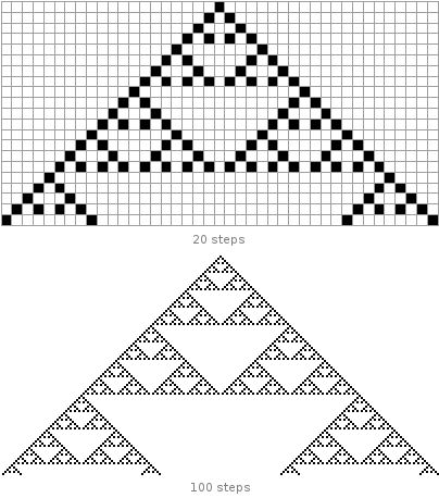 - Mundo infinito: el autómata crece en cada iteración generándose nuevas celdas en los extremos. El problema de esto es que necesitas una cantidad enorme de memoria (idealmente infinita) para que funcione.