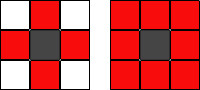 Diferentes vecindarios. Ya hemos visto que hay dos vecindades tradicionales la Moore y la Von Neumann ¿Pero que pasa si queremos aumentar el número de vecinos o su complejidad?. Podríamos aumentar las dimensiones pero ya hemos visto que eso tiene un limite. La solución es ampliar l definición de «vecindad» en lugar de ser solo las celdas en contacto directo podemos usar como vecinos también las de las siguientes hileras. A esto se le denomina el radio de la vecindad.