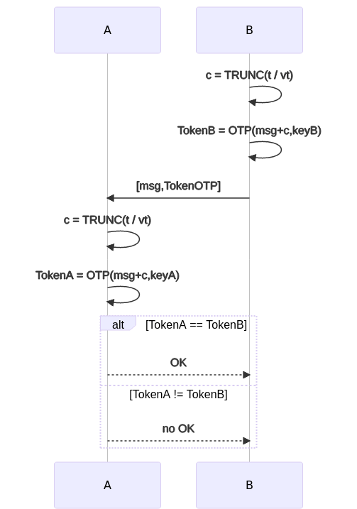 Volviendo a nuestro OTP tenemos: una función que lo calcula (OTP), un contador o timestamp (c) y un secreto compartido entre ambos dispositivos (k) y un comando o mensaje a enviar (msg). En lugar de calcular un token OTP con el contador uniremos el mensaje y el contador y calcularemos un OTP de ambos.