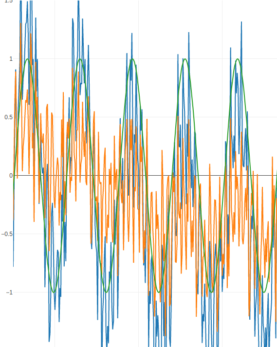 En nuestro simulador podemos usarlo para hacer una curiosa prueba, partiendo de una señal sinusoidal (verde), le añadimos ruido (azul) y usamos el filtro elimina banda para eliminar la señal y dejar solo el ruido (naranja):