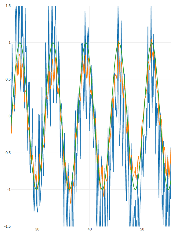 Y ahora usaremos nuestro simulador para hacer una prueba y eliminar ruido. En la imagen resultante podemos ver como la señal original (verde) es afectada por el ruido (azul) y que tras el filtrado (naranja) se elimina gran parte del mismo acercando la forma de la señal a la original.