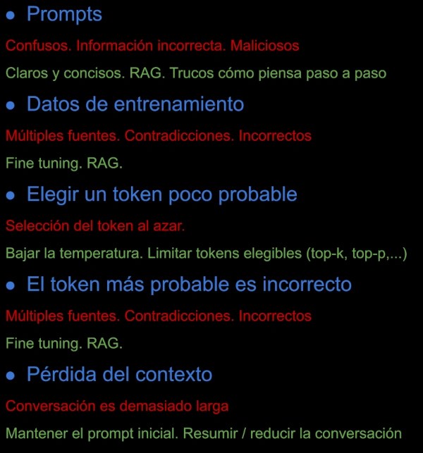 La mejor opción para evitar estas alucinaciones es repasar los prompts y tratar de ser cuidadoso y claro en la redacción de los mismos. Y tratar de no añadir información que no sea completamente cierta. Otros «trucos» que suelen funcionar es pedirle que razone paso a paso o hacerle chantaje emocional (¡En serio!) diciéndole que es muy importante que lo haga correctamente o proprias perder el trabajo (repito: es en serio) - Datos de entrenamiento: los modelos de lenguaje están entrenados con datos de diversas fuentes, por lo que entre ellas se pueden producir contradicciones o directamente contener datos incorrectos. Las dos principales opciones para reducir estás alucinaciones son el fine tuning con datos adecuados o complementar el prompt con información más concreta (por ejemplo usando RAG)