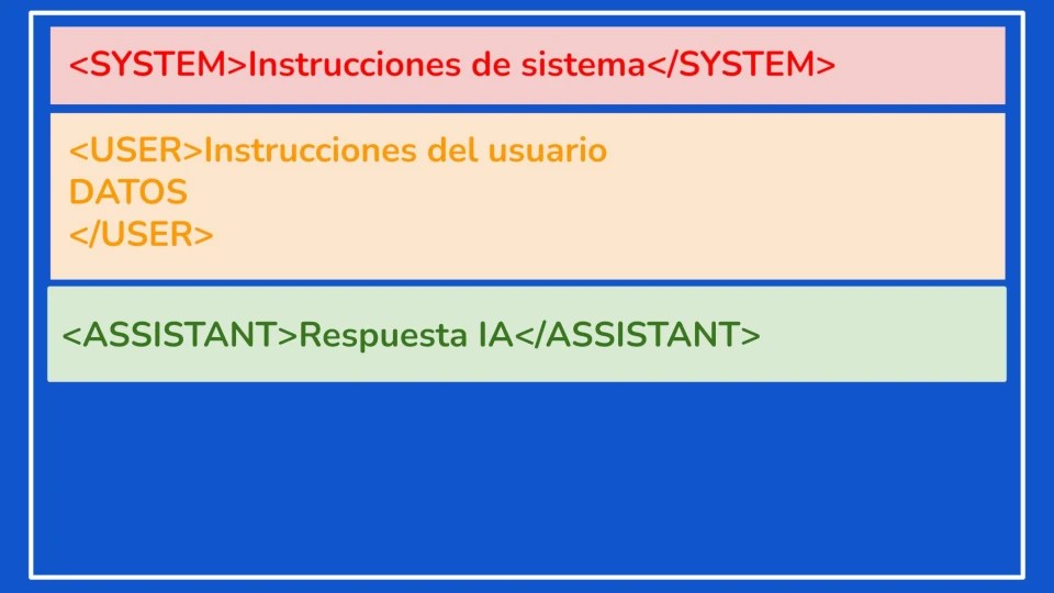 Volviendo a los modelos de lenguaje, cuando se crearon los modelos de lenguaje que pueden chatear y seguir instrucciones, acabaron mezclando el prompt de sistema, prompt de usuario, datos externos y respuestas del modelo en un único texto.. Un modelo que sigue instrucciones opera básicamente con un sistema de etiquetas de texto que indican la instrucción del sistema, la instrucción del usuario y la respuesta del modelo de lenguaje, iterando este proceso en una conversación. La razón por la que los modelos de lenguaje funcionan así se debe a su origen: inicialmente fueron diseñados para completar texto. La capacidad de conversar y seguir instrucciones se descubrió posteriormente, añadiendo etiquetas.