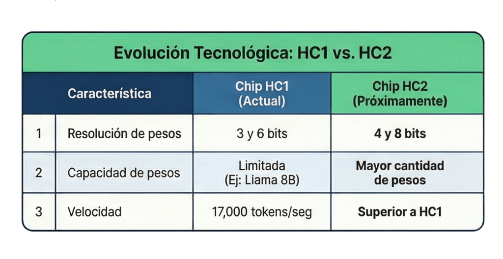 La empresa ya está trabajando en su siguiente evolución, el chip HC2. Se espera que esta nueva versión sea todavía más rápida, soporte una mayor cantidad de pesos y ofrezca una mayor resolución (probablemente pasando a 4 y 8 bits), lo que mejorará la precisión de las respuestas sin sacrificar la velocidad que los hace únicos.